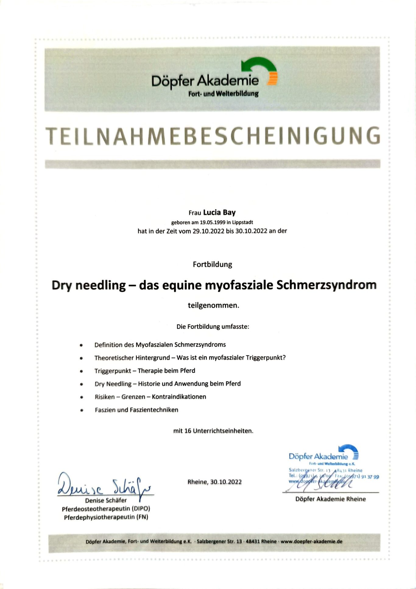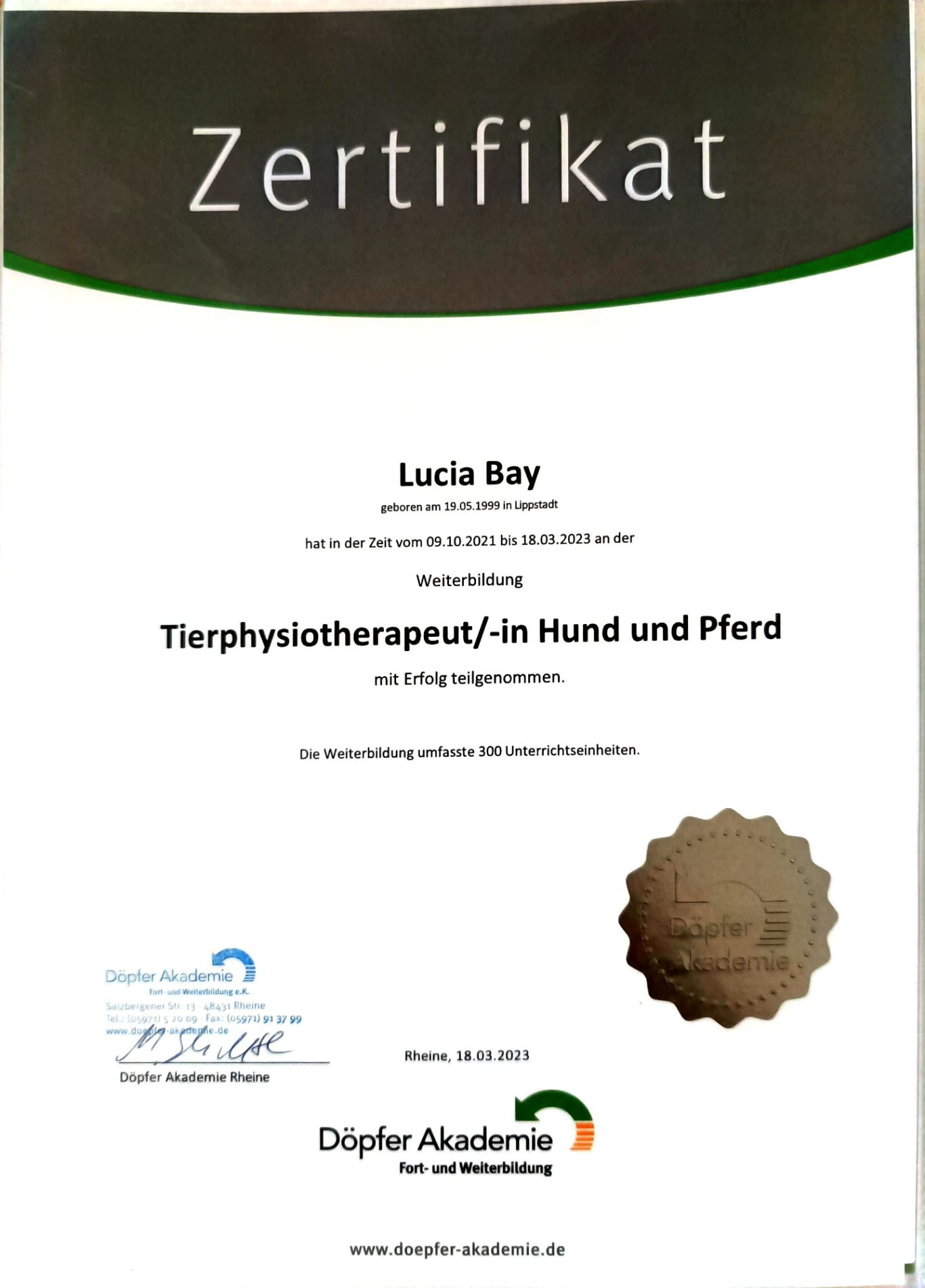 Zertifizierte Tierphysiotherapeutin Hund und Pferd seit 2023 (Ausbildung seit Oktober 2021)